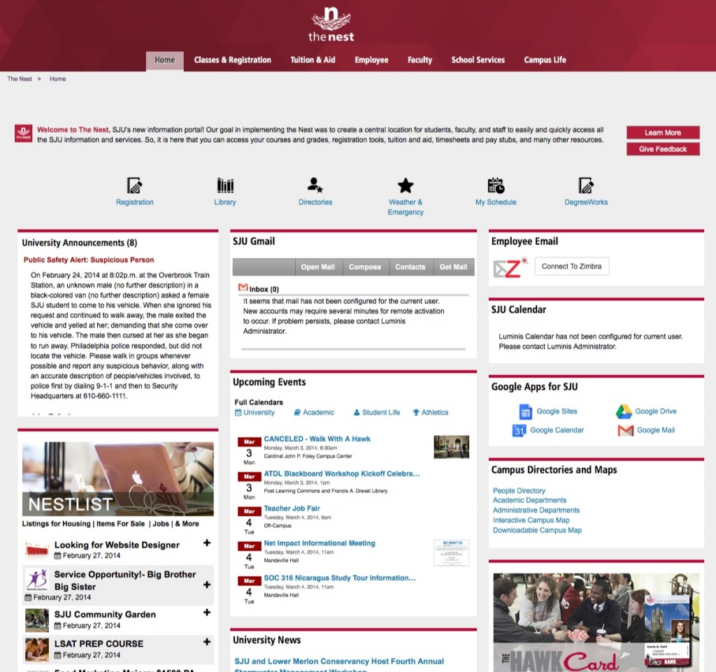 We are pleased to announce that SJU’s new information portal, The Nest, will be making its debut on March 17th. The primary focus of this pilot launch is to enhance the student’s portal experience. For the pilot, we have worked very closely with students and student-focused departments on campus to help determine the immediate needs of our students. We chose to launch before registration for Summer and Fall 2014 to grab the students’ attention and gather feedback prior to the end of Spring semester. After our pilot launch, we will widen our focus to also deliver a content rich portal to our faculty and staff.